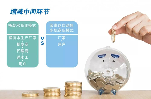 桶裝水的價格包含廠家生產(chǎn)成本、批發(fā)商差價、代理商差價、運(yùn)輸成本、送水工人力成本等諸多費(fèi)用,中間環(huán)節(jié)太多,最終還是有消費(fèi)者買單,而自動售水機(jī)則是廠家直面用戶,大大縮減中間環(huán)節(jié),讓利于客戶,一桶水的價格相比市面上的品牌桶裝水價格要少50%以上,大大節(jié)省企業(yè)開支。
