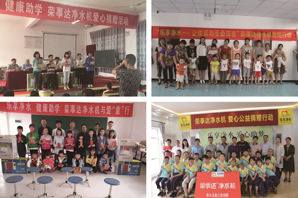 “樂享凈水.健康助學(xué)行動”由榮事達(dá)水工業(yè)公司2011年發(fā)起,向貧困地區(qū)學(xué)校免費(fèi)提供直飲水設(shè)備,援建校園直飲水工程,開展健康知識講座等志愿服務(wù),讓青少年兒童喝上健康衛(wèi)生的飲用水,同時樹立科學(xué)的飲水理念,幫助孩子茁壯成長。
