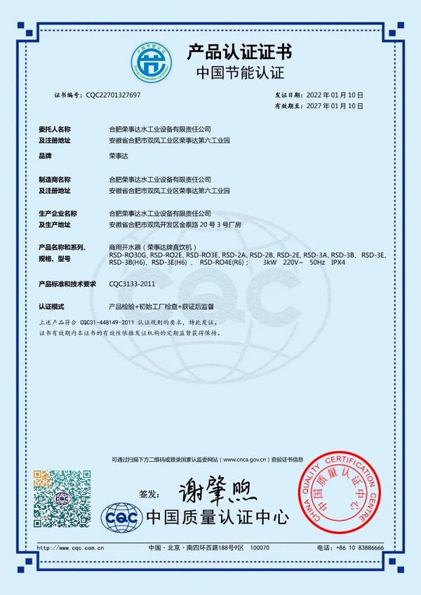 榮事達RSD-RO3E直飲機和榮事達RSD-RO2E幼兒園機均采用節能熱交換技術,省時省電,實現了節能環保理念,獲得了中國節能認證。