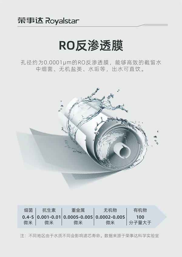 產品采用RO反滲透技術和五級過濾系統,PP棉有效濾除原水中的鐵銹、泥沙等顆粒物;壓鑄活性炭濾芯吸附凈化,有效濾除余氯及異色異味;RO反滲透膜有效濾除水堿水垢及重金屬微生物;后置活性炭改善口感、出水甘冽。完美解決學校飲水各項難題,滿足師生健康飲水需求。