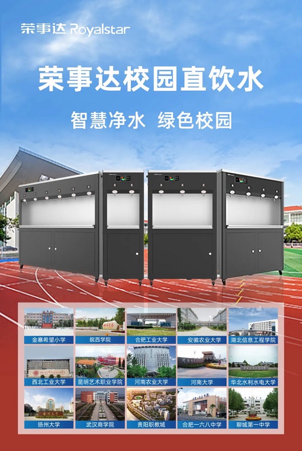 榮事達水工業(yè)先后承建了中國科學(xué)技術(shù)大學(xué)、河南大學(xué)、武漢商學(xué)院、江蘇省丹陽市第五中學(xué)等3500多所學(xué)校的直飲水工程,‘喝’護千萬師生飲水健康。