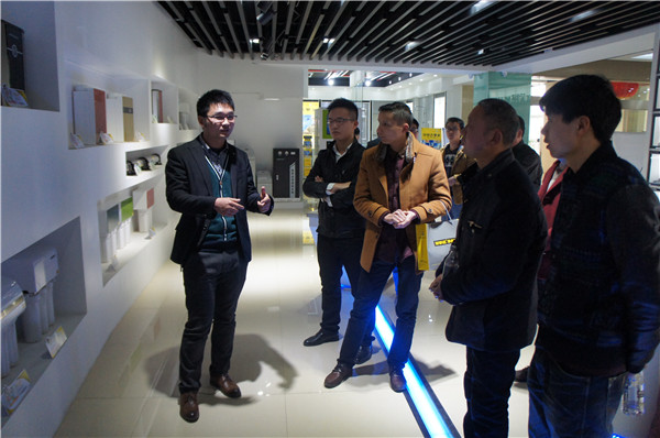 在產品展廳,華中大區總監劉明明為參觀人員介紹了公司產品種類、功能,并分析了凈水行業的現狀和發展前景。之后,一行十余人參觀了園區,看到整齊停放的服務車,參觀者連連稱贊公司這一加盟政策給力,既方便了代理商跑市場,又是十分有效的宣傳方式。在生產車間,參觀者一邊認真聽取講解,一邊仔細觀看生產環節,零距離接觸生產線,親身感受操作流程。