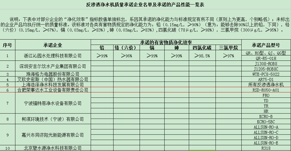 圖為部分反滲透凈水機質量承諾企業名單及承諾的產品性能一覽表
