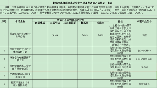 圖為部分超濾凈水機質量承諾企業名單及承諾的產品性能一覽表